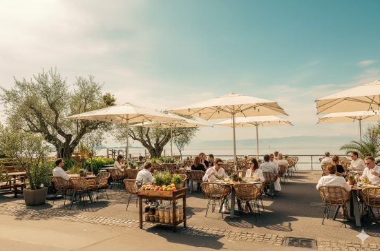 The **Restaurant Kommodore** in Friedrichshafen is located directly on the shores of Lake Constance and offers a marvellous view of the lake and the Alps. The restaurant is known for its **fine German and Mediterranean cuisine**, which is prepared with fresh and high-quality ingredients. The fish and meat specialities are particularly popular, as are the unusual combinations, which are always well seasoned and creatively presented. The cosy ambience and friendly service make every visit a special experience. Whether on the large sun terrace or in the modern dining rooms - you can feel completely at ease here.